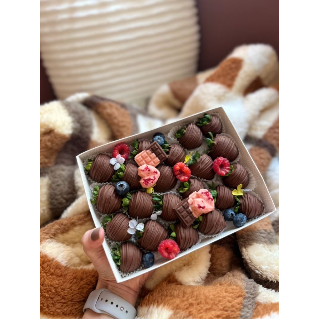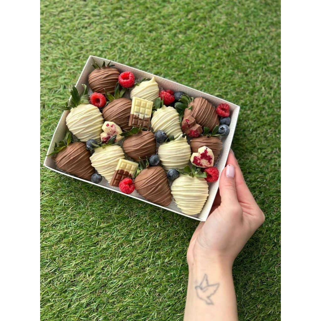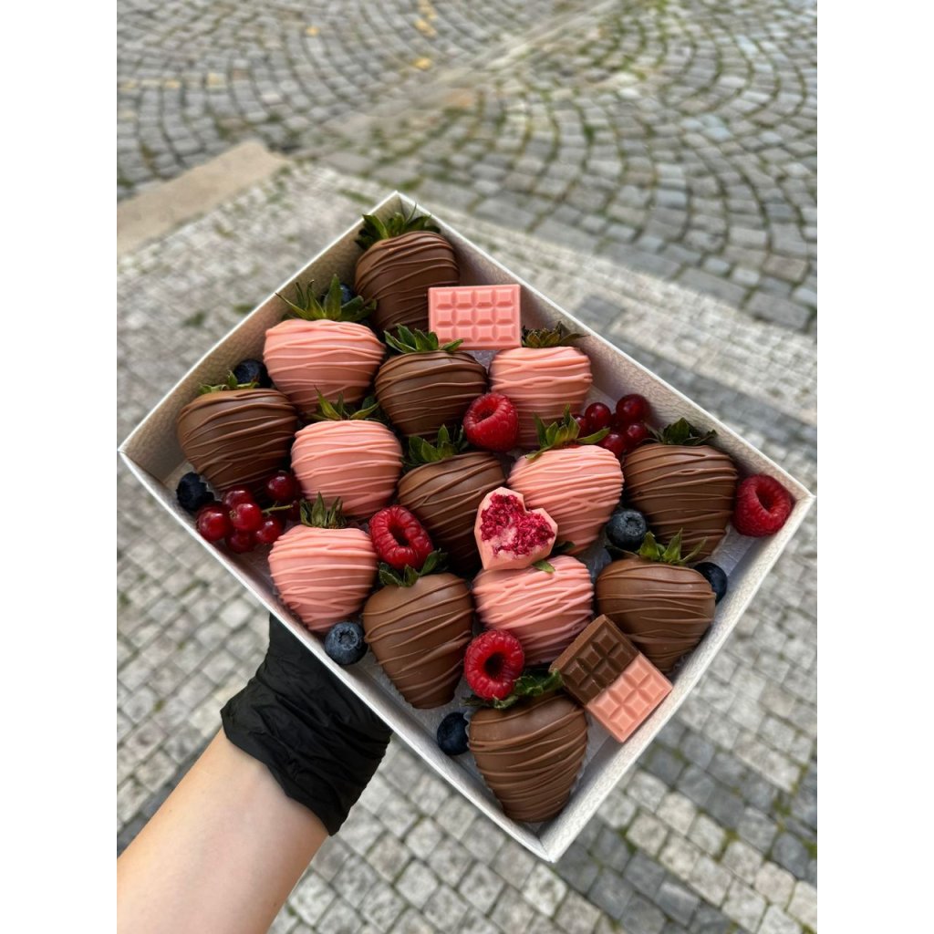 Elegantní kombinace velkých jahod v belgické čokoládě, doplněná malinami, borůvkami a roztomilými srdíčky z čokolády.